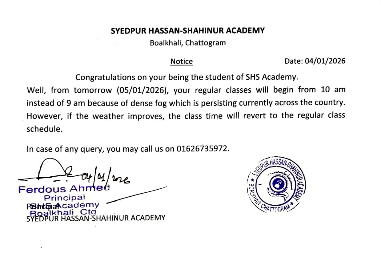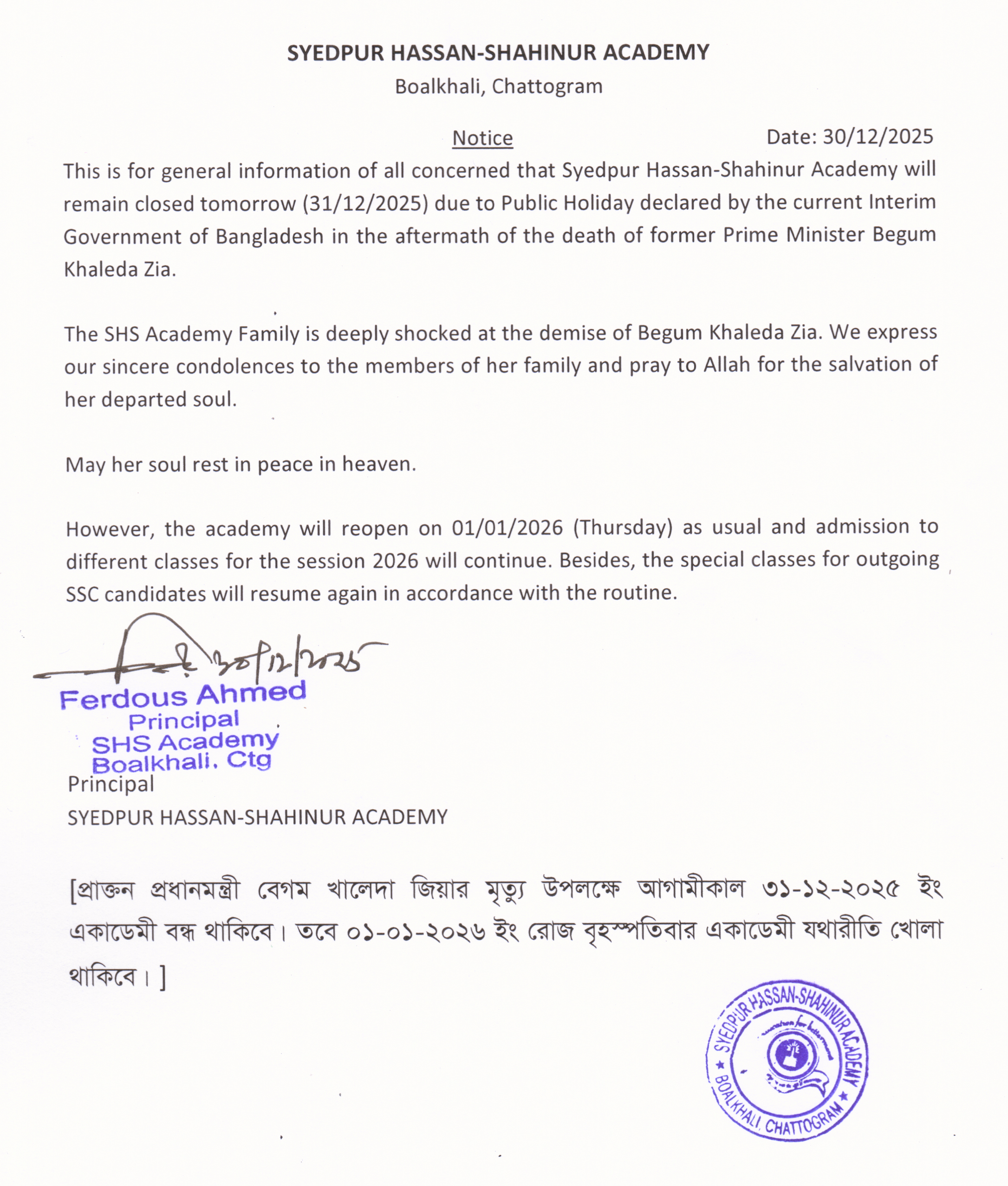 | 2 | Syedpur Hassan-Shahinur Academy will remain closed tomorrow (31/12/2025) due to Public Holiday. | 30 Dec, 2025 | |